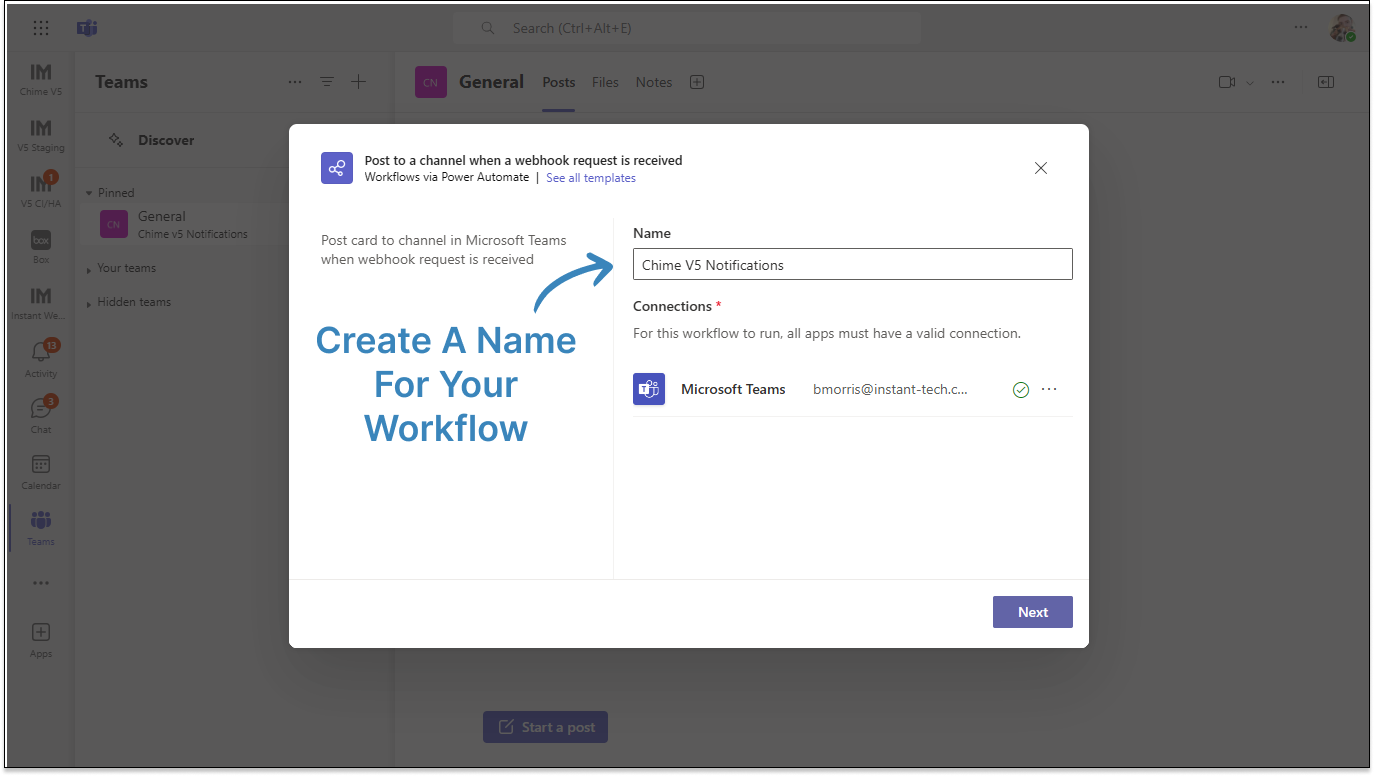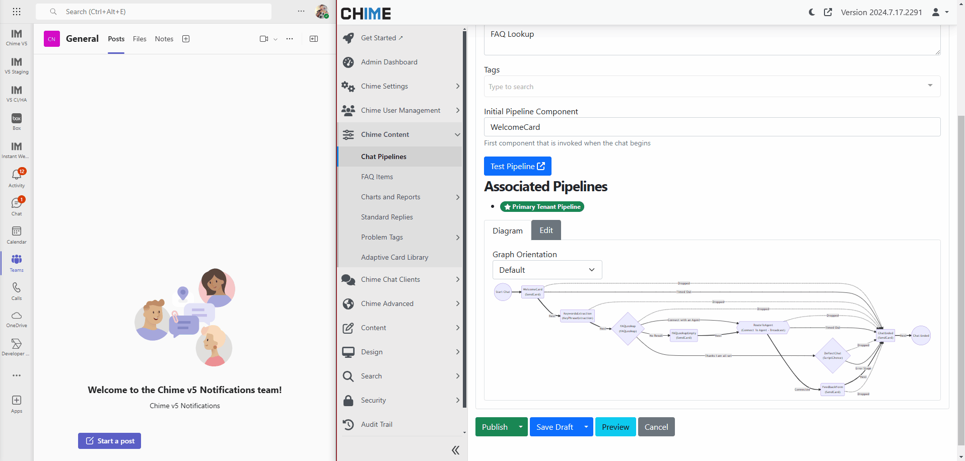 When employing Chime V5 pipeline activities, agents can receive notifications directly on their dashboard when new chat sessions arrive. By integrating Webhooks with Teams, these V5 workflows can be linked to a designated Teams channel, providing improved accessibility through broadcast notifications to Microsoft Teams.