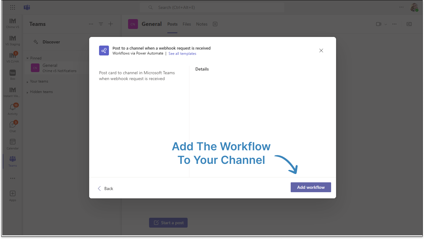Select the Add workflow button to add it to your channel and generate the Post request URL