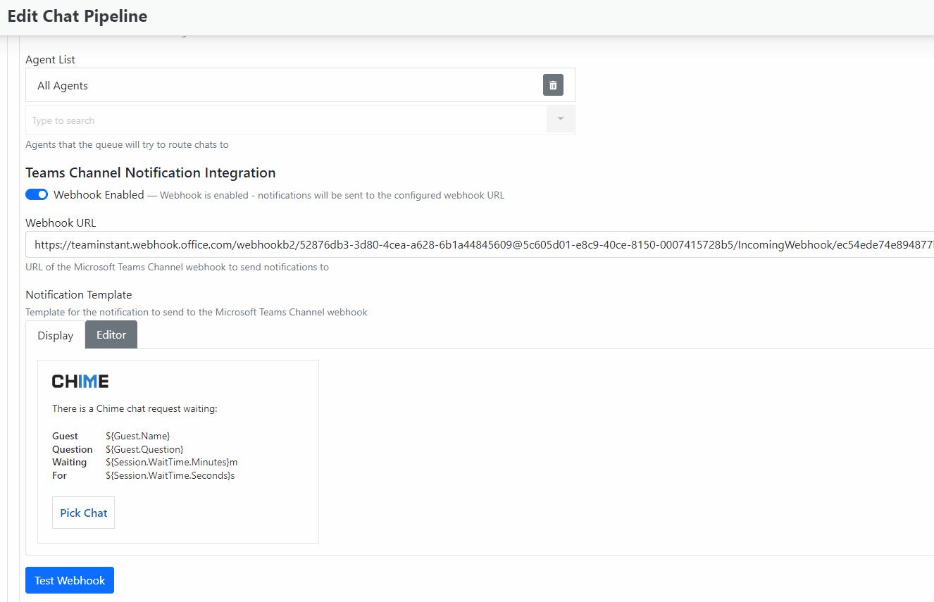 Within the ‘Connect to Agent’ pipeline stage select the Webhook Enabled toggle to enable or disable channel notifications