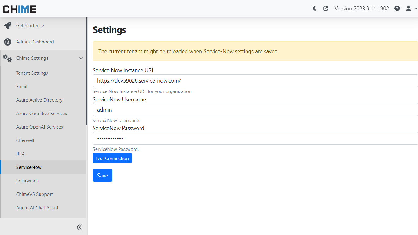 To get started with this integration, your tenant admin will need to specify the ServiceNow instance URL and credentials in Chime's configuration settings. This step ensures a secure connection between Chime and your ServiceNow environment.