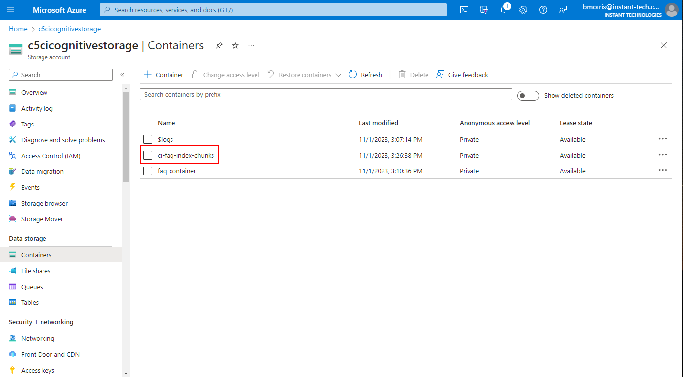 Set up an Azure Storage Account, providing a structured foundation for data storage. You can create multiple storage accounts to segment data for different Chime tenants, but each tenant should have two uniquely-named Blob Containers within the same storage account.