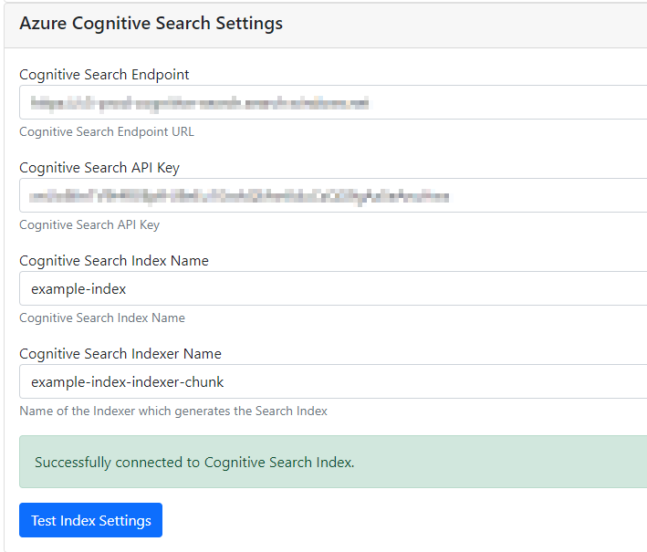 Provide the Cognitive Search Endpoint (visible in the Azure Portal's overview blade for Cognitive Search Service), Cognitive Search Key (admin key is required for full access), Index Name (use the augmented index, e.g., example-index), and optionally, the indexer name. Test these settings to ensure a successful connection, and then save the configuration.