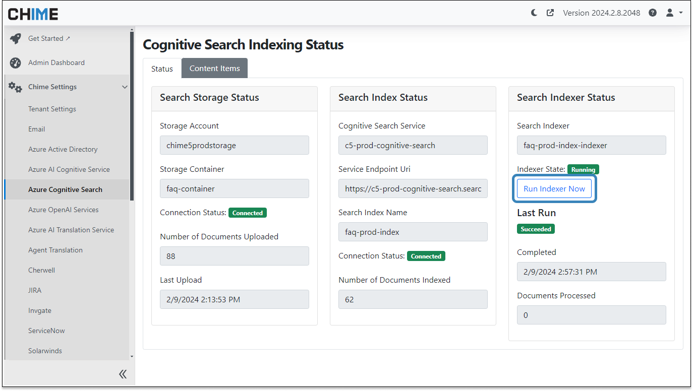 The indexer can be prompted to run within the service desk Admin UI Azure Cognitive Search settings