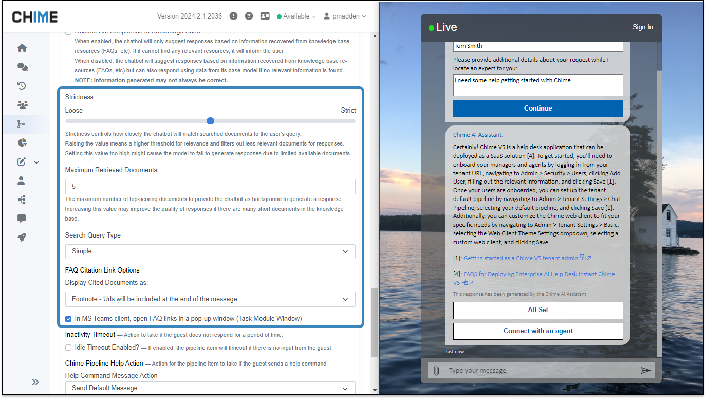 FAQ Citation Link Options: Users can opt to display cited documents as footnotes, where URLs are included at the end of the message, inline within the response, or choose not to link the source documents at all.