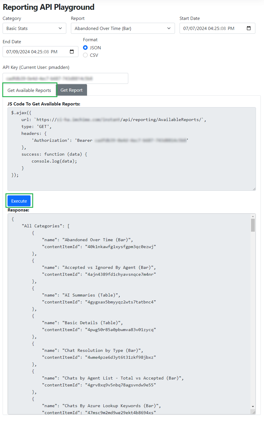 The first view that you get in the Reporting API Playground will be of the Get Available Reports tab. This will allow you to get the name and id of all of the available reports. We would recommend executing this so that you can have a list of all of your report IDs if you want to be able to manually create report requests.